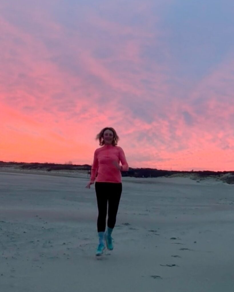 En dan ineens: strand. Ik denk oprecht dat ik nog nooit zo’n breed strand heb gezien. De lucht kleurt roze, de zee bruist. Ik ren richting de golven, maar die liggen verrassend ver weg. De wind snijdt in mijn gezicht, het is een paar graden boven nul, en toch voel ik alleen maar rust. Even verlies ik de strandopgang uit het oog. Vanaf het water zie je die dus niet, maar uiteindelijk vind ik mijn weg terug.